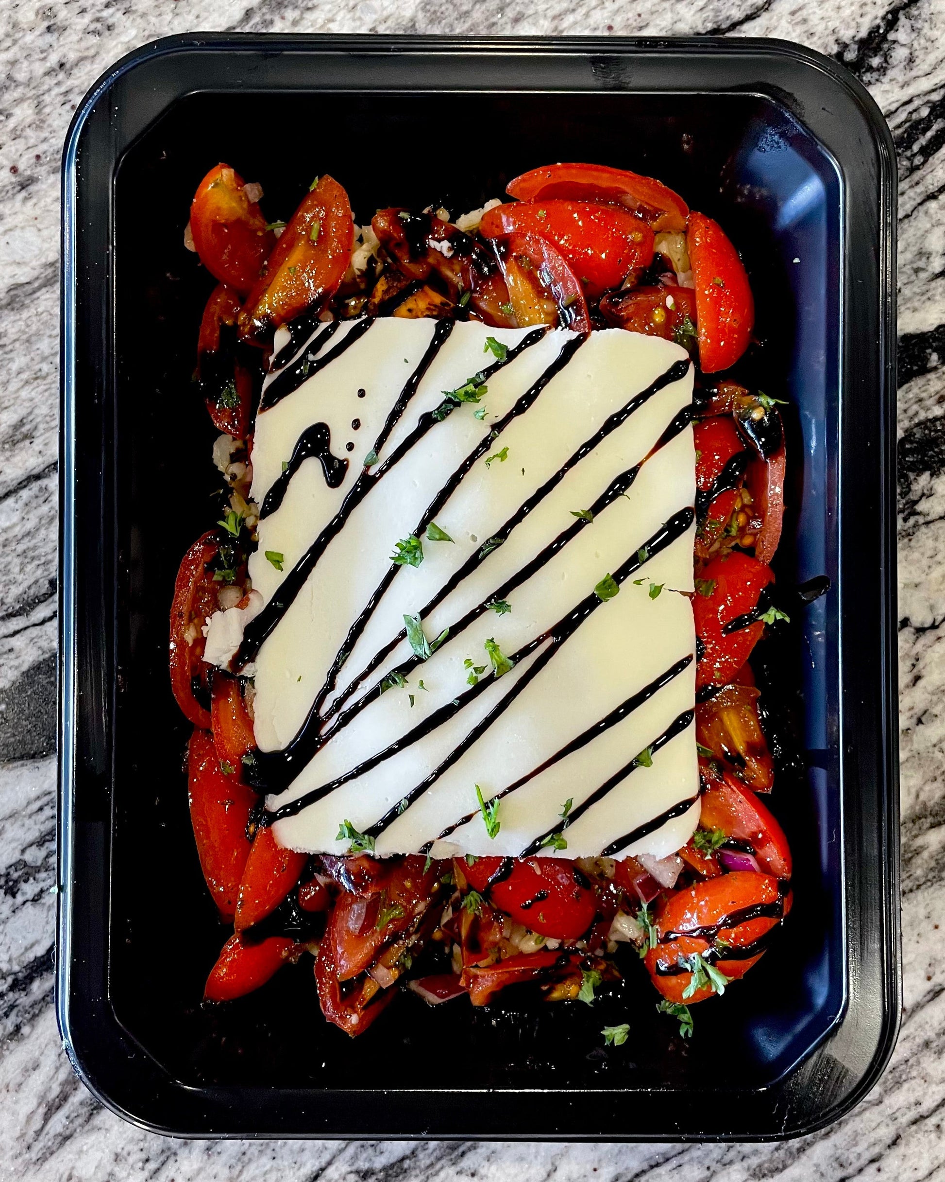 Grilled chicken breast, mozzarella cheese, and bruschetta served over brown rice, topped with a balsamic glaze drizzle.